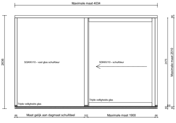 Advies om de deurmaat in verband met bedienbaarheid maximaal op 1500 x 2500 mm (dagmaat 1900 x 2510mm) aan te houden. De advieskozijnhoogte is 2600 mm in verband met de glasopbouw.