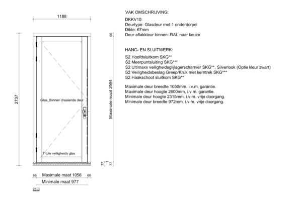 De binnendraaiende glas deur heeft een 1 onderdorpel, maar kan ook voorzien worden van een stapeldorpel.