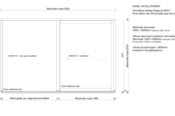 Advies om de deurmaat in verband met bedienbaarheid maximaal op 1500 x 2500 mm (dagmaat 1900 x 2510mm) aan te houden. De advieskozijnhoogte is 2600 mm in verband met de glasopbouw.